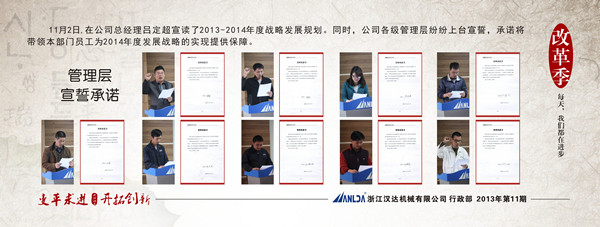 蛇年將逝,馬年將臨。2013年11月2日,浙江漢達機械有限公司的年度戰(zhàn)略會議拉開了帷幕。公司總經(jīng)理斗志激昂,領(lǐng)銜宣讀了2014年年度戰(zhàn)略發(fā)展規(guī)劃。公司的經(jīng)理、車間主任、主管等各級領(lǐng)導(dǎo)們紛紛跟起簽名宣誓。