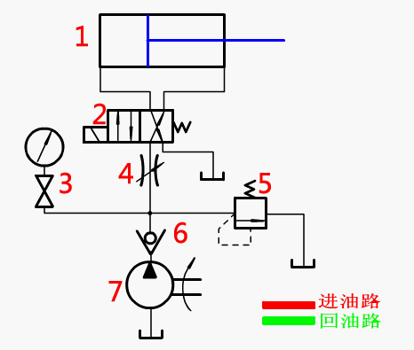油路說明:液壓油在進油管路上從1通過,活塞桿快速移動,從2通過時,活塞桿慢速移動,工進時速度減慢。